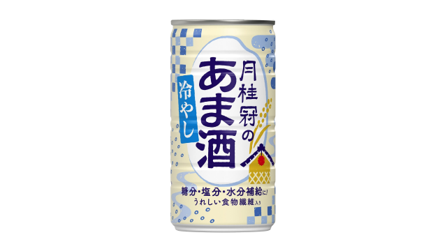 甘酒のやさしい味わいを想起するベージュ色をベースに、ブルー系の配色で涼やかさを演出しました。中央には米粒の形を描き、その中に「月桂冠のあま酒」と記し、「あま酒」は太い文字で目立たせ、「冷やし」の文字をブルーの短冊風装飾に白抜きで強調しました。さらに、酒蔵のイラストにより蔵元の甘酒であることを表現し、下端には「糖分・塩分・水分補給に!」「うれしい食物繊維入り」と記して商品特徴を訴求しています。
