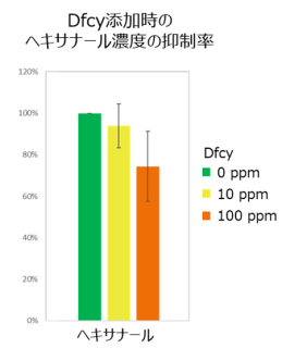 古米の炊飯時にDfcyを添加し、その効果を検証しました。その結果、Dfcyの添加量を増やすのに伴い、古米臭の一因とされる「ヘキサナール」の生成が抑制される傾向が確認されました。