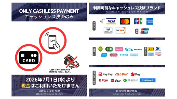 完全キャッシュレス化の実施に伴い、現金でのお支払いは2026年6月30日(火)をもって終了いたします。7月1日(水)以降にご来館いただく際は、各種キャッシュレス決済手段をご用意ください。