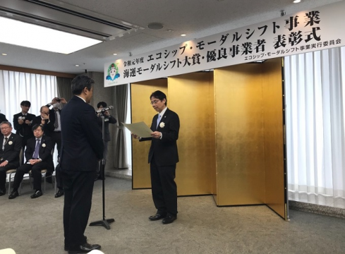 フェリー事業者やRORO船(貨物を積んだトラックごと輸送する船舶)、コンテナ船、自動車船事業者などで組織するエコシップ・モーダルシフト事業実行委員会が、モーダルシフトに貢献した事業者を、「エコシップマーク認定者」とする制度の中で、荷主の月桂冠と物流事業者の日本通運株式会社との取り組みが、令和元年度「優良事業者」として認定され「国土交通省海事局長表彰」を受けました。「優良事業者」の中で、最も貢献度が高い事業者として両社に「海運モーダルシフト大賞」が授与されました。「海運モーダルシフト大賞」は今年から新たに授与されるようになったもので、「国土交通省海事局長表彰」(エコシップマーク優良事業者)とも併せて、日本酒製造業者として初の受賞となりました。