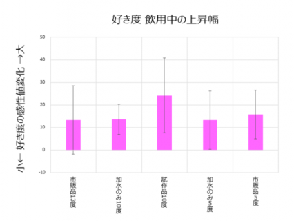 各日本酒の好き度上昇幅(飲用開始時と飲用中最大値の差)を比較したところ、香味を調整した低アルコール日本酒と、市販酒5度の日本酒で比較的高い値が見られました。上昇幅が大きいほど、飲用した時の好みの度合いも高くなる可能性があります。