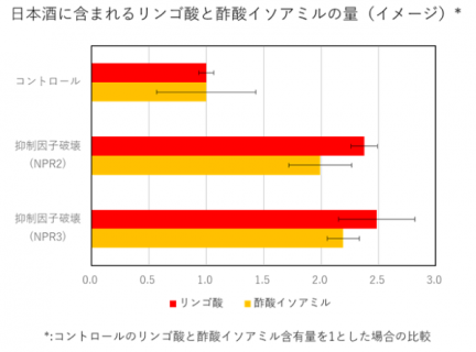 そこでTORC1を抑制する因子に着目し、まずその抑制因子を構成するNPR2とNPR3**をコードする遺伝子をそれぞれ破壊した清酒酵母を育種しました。次に育種した酵母を用いて日本酒醸造を行い、香気成分・有機酸測定を行いました。その結果、吟醸香の主成分である酢酸イソアミルをはじめ、酢酸イソブチル、酢酸β-フェネチルといった香り成分が増加し、酸味に関わるリンゴ酸も増加することが確認できました(下図)。