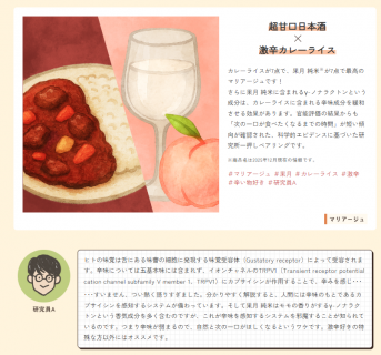 「料理と日本酒のペアリングって何?」では、「マリアージュ」「ウォッシュ」といったペアリングの考え方を取り上げ、なぜ相性が良いと感じるのか、その仕組みを分かりやすく紹介しています。「ペアリング一覧」では、生酒とスモークチーズ、超甘口日本酒と激辛カレーライスなど、意外性のある組み合わせを含む具体的なペアリング例を、研究員のコメントとともに掲載しています。